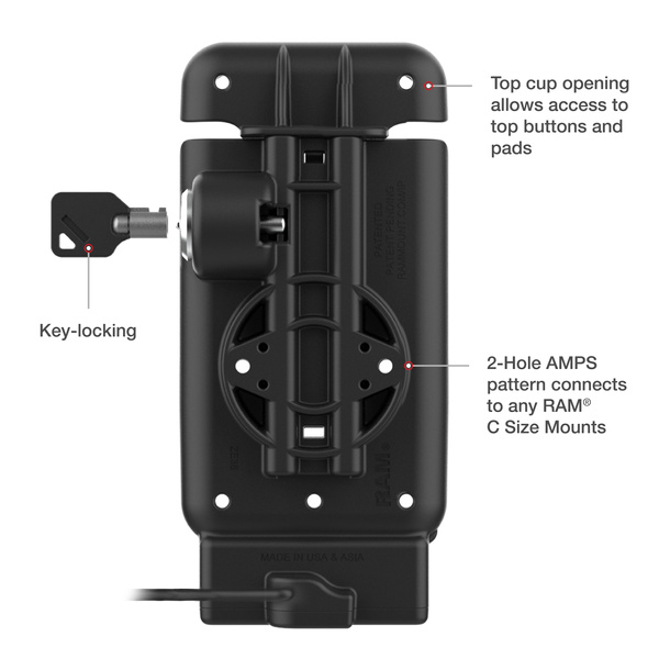 The GDS Powered Locking Vehicle Dock for Handhelds with IntelliSkin (RAM-GDS-DOCKL-V15-AU) is a rugged dock that will meet and exceed the demands of modern workflows, featuring integrated pogo pins that perfectly align with IntelliSkin that feature an external USB-C port. The spring-loaded design of this dock allows for a quick one-handed insertion or removal of your device. The back cavity of the dock accommodates ergonomic accessories secured to the back of the device. An integrated cutout on the top allows for the ability to access buttons, ports, or scanners without removing the device from the dock. The key lock provides peace of mind and theft deterrence in high-traffic environments. Complete the solution by building your mountthis holder is RAM Compatible featuring a 2-hole AMPS pattern for adding a diamond ball adapter. Always Protected. Always Connected. BrandSymbolRAM-GDS-DOCKL-V15-AUProducer code793442028892SeriesHardware Included(2) Keys|(2) #8-32 x 5/8" Machine Screws|(2) #8-32 x 3/4" Machine Screws|(2) #8-32 Nylock Nuts|(1) Cable Clamp KitHole Pattern2-Hole AMPS: 1.912"MaterialsHigh strength compositePackaging TypePoly BagOutput Voltage5V - 12V @ 3APower Output15WInput ConnectorUSB Type-CInput Cable Length380mmProduct Weight390 g - CompatibilitySamsung XCover7 ProSamsung XCover6 ProZebra EM45