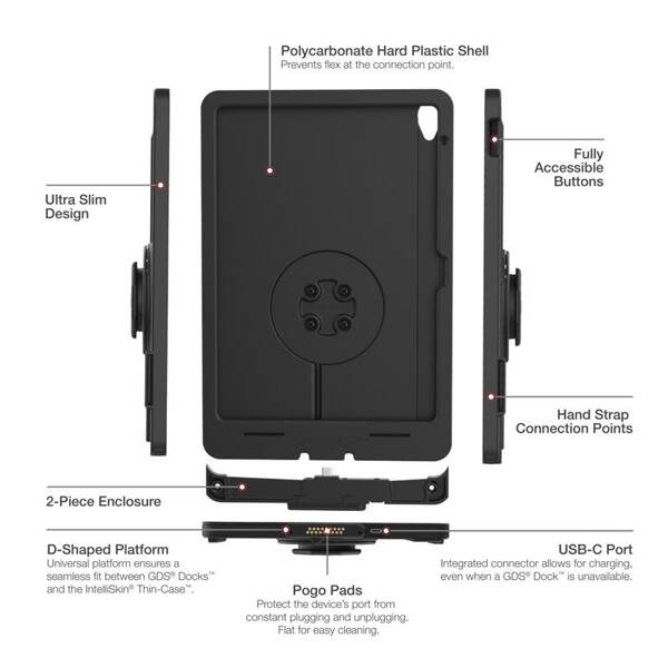- Two-piece, hard plastic enclosure for Apple iPad 10th & 11th Gen with integrated GDS® connector and pogo pads