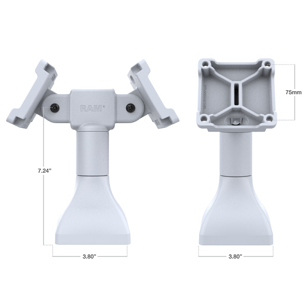 The RAM 7" Pedestal Mount with Dual 75mm VESA Adapters - Gray (RAP-D11H2-7-V75-GRY) provides a sturdy and streamlined way to mount two displays or devices back-to-back on a single pedestal. Each head includes a 75mm VESA plate with integrated cable management cutouts, allowing power and data cables to route neatly through the pedestal and out the base for a clean, professional workspace. With 180 tilt adjustment on each head, users can easily achieve optimal viewing angleswhether the setup is for shared workstations, control panels, or fleet monitoring environments. The drill-down base delivers a secure, fixed installation ideal for high-traffic or semi-permanent setups. Durable, adaptable, and built for precision alignment, this dual-mount solution brings both functionality and visual organization to any business space. Made in a light gray color, the mount blends seamlessly into clean, modern, and aesthetic environments where subtlety and professional appearance matter. BrandSymbolRAP-D11H2-7-V75-GRYProducer code793442032608NewYesHardware IncludedAssesmbly HardwareProduct DimensionsHeight from Base to Tilt Bolt: 7.24"|Base Width: 3.8"|Base Depth: 3.8"Hole Pattern75 x 75mm VESAMaterialsHigh strength compositePackaging TypeBox - Recommended products