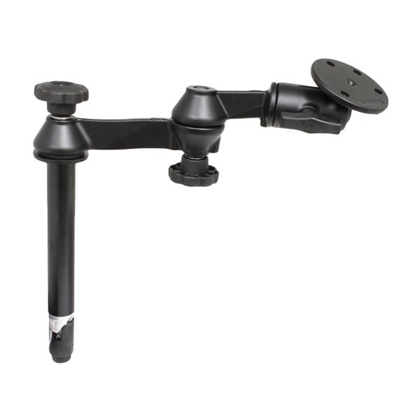 The RAM-VP-SW1-8-240 consists of a 8" upper male Tele-Pole, double swing arm and 3.68" round base. The Tele-Pole can be easily adjusted by turning the knob at the top of the post. Once the knob has been tightened, the Tele-Pole becomes a rigid support for connecting devices or cradles. The Tele-Pole will connect to any RAM vehicle base with a welded female Tele-Pole. The double swing arm with rotating plate, allows you to twist and tilt the viewing angle of your connected electronic device, when mounted on your RAM Vehicle Mount. The rotating swivel arm gives you even more viewing positions for your mounted electronic device while holding everything firmly in place. The length of the double swing arm is 12". The 3.68" round base contains pre-drilled holes that connects to RAM Tough-Dock Powered Docking Stations. BrandSymbolRAM-VP-SW1-8-240Producer code793442006210SeriesProduct Weight1882 gHardware IncludedAssembly HardwareHole PatternSee Drawing3-Hole 120 Degree (Large)Plate Size3.68" DiameterMaterialsPowder coated steel|Marine-grade aluminumPackaging TypeBoxBall & Socket SizeC Size 1.5" (Holds 1814.37 gramss)Device or Accessory TypeMonitorComponent partsRAM-240URAM-VB-110-1NBURAM-VP-TTM8UBall SizeC Size (1.5") - Recommended products