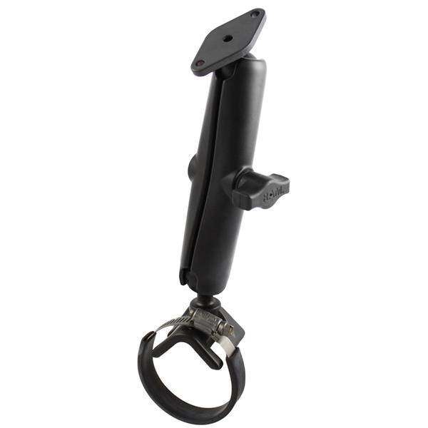 The RAM-B-108-C-STRAP40-238 consists of a long length B size arm with a 2.43" x 1.31" diamond base with 2 hole AMPS pattern and a strap clamp base for rails between 2" and 3" diameter.