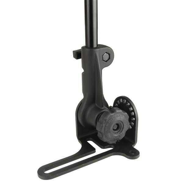 - Universal vehicle mount attaches to seat rail without any drilling necessary