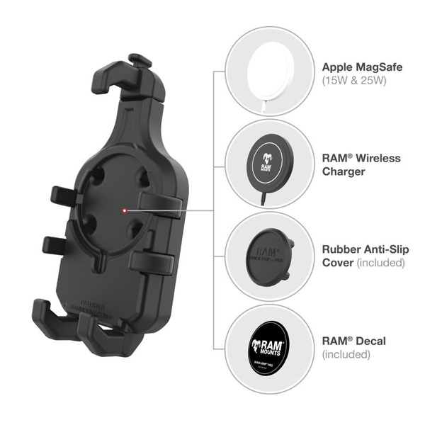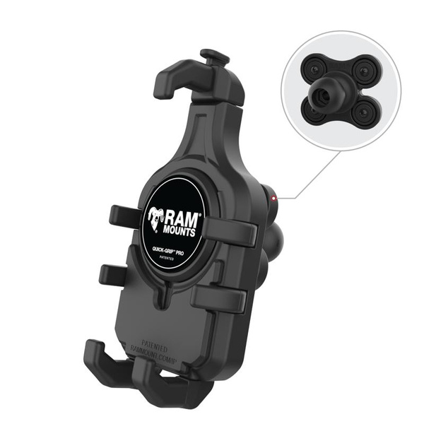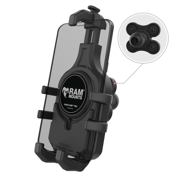 The RAM Quick-Grip Pro Phone Holder with Ball & Vibration Damper (RAM-HOL-PD5BVU) is the next evolution of in RAM Quick-Grip series with an integrated vibration damper. Re-designed with a new, sleek look and integrated rubber side arms to provide a secure, no-slip hold on your phone. This phone holder features an integrated cavity for an Apple Magsafe puck, allowing you to turn the phone holder into a wireless charging solution. Not interested in charging? No problem! The included anti-slip cover ensures a flush fit when the Apple MagSafe puck is not installed. The RAM Quick-Grip Pro features a spring-loaded design that allows easy one-handed insertion and removal of your phone. The adjustable side arms ensure that your phone will remain secured in the holder without blocking any ports or buttons. Complete the solution by building your mountthis holder is RAM Compatible and includes a B size pin-lock ball. RAM recommends installing the provided device tether when this holder is used in a vehicle with an open cockpit. It is important to verify the dimensions of your handheld device with its case, sleeve, or skin when determining the overall size. BrandSymbolRAM-HOL-PD5BVUProducer code793442026553SeriesHardware IncludedAssembly HardwareHolder DimensionsHeight Range: 5.5" - 7.75"|Width Range: 2.625" - 3.75"|Max Depth: .67"Ball SizeB Size (1")Weight CapacityStandard Use: 907.18 gramss|Heavy-Duty Use: 453.59 gramsMaterialsHigh strength compositePackaging TypePoly BagProduct Weight272 g - CompatibilityApple iPhone 6s PlusApple iPhone 8 PlusApple iPhone XApple iPhone XrApple iPhone XsApple iPhone Xs MaxApple iPhone 11Apple iPhone 11 ProApple iPhone 11 Pro MaxApple iPhone 12Apple iPhone 12 ProApple iPhone 12 Pro MaxApple iPhone 13Apple iPhone 13 ProApple iPhone 13 Pro MaxApple iPhone 14Apple iPhone 14 PlusApple iPhone 14 ProApple iPhone 14 Pro MaxApple iPhone 15Apple iPhone 15 PlusApple iPhone 15 ProApple iPhone 15 Pro MaxApple iPhone 16Apple iPhone 16 PlusApple iPhone 16 ProApple iPhone 16 Pro MaxBlackberry Evolve XBlackview BV9900Blackview BV9900 ProGoogle Pixel 2Google Pixel 2 XLGoogle Pixel 3Google Pixel 3 XLGoogle Pixel 3aGoogle Pixel 3a XLGoogle Pixel 4Google Pixel 4 XLGoogle Pixel 4aGoogle Pixel 5Google Pixel 6Google Pixel 6 ProGoogle Pixel 7Google Pixel 7 ProGoogle Pixel 8Google Pixel 8 ProHTC U11Huawei Mate 20 ProHuawei Mate 20 XHuawei P30 ProLG Aristo 2LG Fiesta 2 LTELG Fiesta LTELG G6LG G6+LG G7 ThinQLG G8 ThinQLG G8S ThinQLG HarmonyLG K20LG K20 PlusLG Q6LG Stylo 3 Plus TitanLG Stylo 4LG V30LG V35 ThinQLG V40 ThinQLG V50 ThinQLG X ventureLG Zone 4Motorola moto e4Motorola moto e4 plusMotorola moto g5s plusMotorola moto g6Motorola moto g7 powerMotorola moto X4Motorola moto z2Motorola moto z2 playMotorola moto z3Nokia 2Nokia 3Nokia 5Nokia 8Nokia 7 plusNokia 8 SiroccoNokia 9 PureViewOnePlus 7OnePlus 6TOnePlus 7 ProOnePlus 7TOnePlus 7T ProPanasonic Eluga X1 ProRazer Phone 2Samsung Galaxy A10Samsung Galaxy A10eSamsung Galaxy A10sSamsung Galaxy A11Samsung Galaxy A15Samsung Galaxy A20Samsung Galaxy A20eSamsung Galaxy A30Samsung Galaxy A40Samsung Galaxy A50Samsung Galaxy A50sSamsung Galaxy A6Samsung Galaxy A6+Samsung Galaxy A7Samsung Galaxy A70Samsung Galaxy A8Samsung Galaxy A80Samsung Galaxy A9 (2016)Samsung Galaxy A90 5GSamsung Galaxy J2 (2016)Samsung Galaxy J5Samsung Galaxy J7 (2017)Samsung Galaxy J7 (2018)Samsung Galaxy J7 Prime 2Samsung Galaxy Note 10Samsung Galaxy Note 10 PlusSamsung Galaxy Note 8Samsung Galaxy Note 9Samsung Galaxy Note Fan EditionSamsung Galaxy Note20Samsung Galaxy Note20 UltraSamsung Galaxy S10Samsung Galaxy S10 5GSamsung Galaxy S10+Samsung Galaxy S10eSamsung Galaxy S20Samsung Galaxy S20 FE 5GSamsung Galaxy S20 Ultra 5GSamsung Galaxy S20+Samsung Galaxy S21 5GSamsung Galaxy S21 Ultra 5GSamsung Galaxy S21+ 5GSamsung Galaxy S22 5GSamsung Galaxy S22 Ultra 5GSamsung Galaxy S22+ 5GSamsung Galaxy S23Samsung Galaxy S23 UltraSamsung Galaxy S23+Samsung Galaxy S24Samsung Galaxy S24 UltraSamsung Galaxy S24+Samsung Galaxy S8Samsung Galaxy S8 ActiveSamsung Galaxy S8+Samsung Galaxy S9Samsung Galaxy S9+Samsung Galaxy XCover 4Samsung Galaxy XCover 5Samsung Galaxy XCover FieldProSamsung Galaxy XCover ProSamsung Galaxy XCover6 ProSamsung Galaxy XCover7Social Mobile Rhino C6Sony Xperia 1 VSony Xperia 10 VSony Xperia C4Sony Xperia L1Sony Xperia L2Sony Xperia XSony Xperia X PerformanceSony Xperia XASony Xperia XA UltraSony Xperia XA1Sony Xperia XA1 PlusSony Xperia XA1 UltraSony Xperia XA2Sony Xperia XA2 UltraSony Xperia XZSony Xperia XZ PremiumSony Xperia XZ1Sony Xperia XZ2Sony Xperia XZ3Sony Xperia XZsSony Xperia Z3Sony Xperia Z3+Sony Xperia Z5Xiaomi Mi 9Xiaomi Mi 9 ExplorerXiaomi Mi Mix 2SXiaomi Mi Mix 3Xiaomi Redmi Note 7ZTE Axon 10 ProZTE Axon 9 ProApple iPhone 16eSamsung Galaxy S25Samsung Galaxy S25 UltraSamsung Galaxy S25+Samsung Galaxy XCover7 ProApple iPhone 17Apple iPhone 17 ProApple iPhone 17 Pro MaxApple iPhone AirGoogle Pixel 9Google Pixel 9 ProGoogle Pixel 9 Pro XLGoogle Pixel 9a