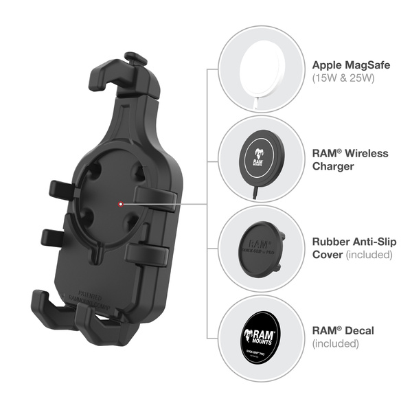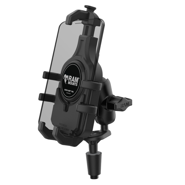 The RAM Quick-Grip Pro Phone Mount with Motorcycle Fork Stem Base (RAM-B-176-A-PD5U) secures into the cylindrical bore wall of fork stems and features the next evolution of the RAM Quick-Grip series. The phone holder is re-designed with a new, sleek look and integrated rubber side arms to provide a secure, no-slip hold on your phone. It also features an integrated cavity for an Apple MagSafe puck, allowing you to turn the phone holder into a wireless charging solution. Not interested in charging? No problem! The included anti-slip cover ensures a flush fit when the Apple MagSafe puck is not installed. The RAM Quick-Grip Pro features a spring-loaded design that allows easy one-handed insertion and removal of your phone. The adjustable side arms ensure that your phone will remain secured in the holder without blocking any ports or buttons. This kit's included motorcycle fork stem base fits into the cylindrical bore wall of fork stems that that measure 12mm to 38mm (.5 to 1.49) in diameter. RAM recommends installing the provided device tether when this holder is used in a vehicle with an open cockpit. It is important to verify the dimensions of your handheld device with its case, sleeve, or skin when determining the overall size. BrandSymbolRAM-B-176-A-PD5UProducer code793442026652SeriesProduct Weight454 gHardware IncludedAssembly Hardware|(1) Expansion Plug for 12mm - 38mm (.5" - 1.49") Fork Stem Holes|(1) M5 x 60mm Machine Screw|(1) Steel Washer Set|(1) Nut Pocket Washer Set|(1) Brass Nylock NutHolder DimensionsHeight Range: 5.5" - 7.75"|Width Range: 2.625" - 3.75"|Max Depth: .67"Socket To Socket Length1.75"Ball SizeB Size (1")Weight CapacityStandard Use: 907.18 gramss|Heavy-Duty Use: 453.59 gramsMaterialsMarine-grade aluminum|High strength compositePackaging TypePoly BagVehicleAprilia RS 660Aprilia RS 660 ExtremaAprilia RSV4 1100Aprilia RSV4 1100 FactoryAprilia RSV4 APRC ABS SBK SEAprilia RSV4 Factory APRCAprilia RSV4 RAprilia RSV4 R APRCAprilia RSV4 RFAprilia RSV4 RRAprilia RSV4 RR MisanoAprilia Tuono V4 1100Aprilia Tuono V4 1100 FactoryAprilia Tuono V4 1100 RRAprilia Tuono V4 1100 RR MisanoAprilia Tuono V4 RAprilia Tuono V4 R APRCprilia RSV4BMW F650BMW F800RBMW HP4 RaceBMW M1000RBMW M1000RRBMW R nineT RacerBMW S1000RRCFMOTO 300SSDucati 848Ducati 1199 PanigaleDucati 1199 Panigale RDucati 1199 Panigale SDucati 1199 Panigale S TricoloreDucati 1199 SuperleggeraDucati 1299 PanigaleDucati 1299 Panigale R Final EditionDucati 1299 Panigale SDucati 1299 SuperleggeraDucati 899 PanigaleDucati 959 PanigaleDucati 959 Panigale CorseDucati Panigale V2Ducati Panigale V2 BaylissDucati Panigale V4Ducati Panigale V4 RDucati Panigale V4 SDucati Panigale V4 S CorseDucati Panigale V4 SPDucati Panigale V4 SP2Ducati Superleggera V4Honda CBR250RHonda CBR250R ABSHonda VFR1200Honda VFR1200 DCTHonda VFR1200X ABSHonda VFR1200X DCT ABSKawasaki Ninja H2Kawasaki Ninja H2 SXKawasaki Ninja H2 SX SEKawasaki Ninja H2 SX SE PlusKawasaki Ninja H2RKawasaki Ninja ZX-14Kawasaki Ninja ZX-14RKawasaki Ninja ZX-14R ABSKawasaki Ninja ZX-14RRSuzuki GSX-R1000Suzuki GSX-R1000RSuzuki GSX-R1000RZSuzuki GSX-R600Suzuki GSX-R600ZSuzuki GSX-R750Suzuki GSX-R750ZSuzuki HayabusaSuzuki Hayabusa GSX1300RTriumph Daytona Moto2 765Triumph Speed Triple 765 Moto 2Triumph Street Triple 765 Moto 2Triumph Street Triple 765 RTriumph Street Triple 765 RSTriumph Street Triple 765 SYamaha MT-10Yamaha MT-10 SPYamaha R1Yamaha R1 LEYamaha R1 World GPYamaha R1MYamaha R1SYamaha R6Yamaha R6 GYTRYamaha R6 World GPYamaha R6SYamaha XV1900 Star EluderComponent partsRAM-B-201U-ARAM-B-342URAM-HOL-PD5BU - CompatibilityApple iPhone 6s PlusApple iPhone 8 PlusApple iPhone XApple iPhone XrApple iPhone XsApple iPhone Xs MaxApple iPhone 11Apple iPhone 11 ProApple iPhone 11 Pro MaxApple iPhone 12Apple iPhone 12 ProApple iPhone 12 Pro MaxApple iPhone 13Apple iPhone 13 ProApple iPhone 13 Pro MaxApple iPhone 14Apple iPhone 14 PlusApple iPhone 14 ProApple iPhone 14 Pro MaxApple iPhone 15Apple iPhone 15 PlusApple iPhone 15 ProApple iPhone 15 Pro MaxApple iPhone 16Apple iPhone 16 PlusApple iPhone 16 ProApple iPhone 16 Pro MaxApple iPhone 16eBlackberry Evolve XBlackview BV9900Blackview BV9900 ProGoogle Pixel 2Google Pixel 2 XLGoogle Pixel 3Google Pixel 3 XLGoogle Pixel 3aGoogle Pixel 3a XLGoogle Pixel 4Google Pixel 4 XLGoogle Pixel 4aGoogle Pixel 5Google Pixel 6Google Pixel 6 ProGoogle Pixel 7Google Pixel 7 ProGoogle Pixel 8Google Pixel 8 ProHTC U11Huawei Mate 20 ProHuawei Mate 20 XHuawei P30 ProLG Aristo 2LG Fiesta 2 LTELG Fiesta LTELG G6LG G6+LG G7 ThinQLG G8 ThinQLG G8S ThinQLG HarmonyLG K20LG K20 PlusLG Q6LG Stylo 3 Plus TitanLG Stylo 4LG V30LG V35 ThinQLG V40 ThinQLG V50 ThinQLG X ventureLG Zone 4Motorola moto e4Motorola moto e4 plusMotorola moto g5s plusMotorola moto g6Motorola moto g7 powerMotorola moto X4Motorola moto z2Motorola moto z2 playMotorola moto z3Nokia 2Nokia 3Nokia 5Nokia 8Nokia 7 plusNokia 8 SiroccoNokia 9 PureViewOnePlus 7OnePlus 6TOnePlus 7 ProOnePlus 7TOnePlus 7T ProPanasonic Eluga X1 ProRazer Phone 2Samsung Galaxy A10Samsung Galaxy A10eSamsung Galaxy A10sSamsung Galaxy A11Samsung Galaxy A15Samsung Galaxy A20Samsung Galaxy A20eSamsung Galaxy A30Samsung Galaxy A40Samsung Galaxy A50Samsung Galaxy A50sSamsung Galaxy A6Samsung Galaxy A6+Samsung Galaxy A7Samsung Galaxy A70Samsung Galaxy A8Samsung Galaxy A80Samsung Galaxy A9 (2016)Samsung Galaxy A90 5GSamsung Galaxy J2 (2016)Samsung Galaxy J5Samsung Galaxy J7 (2017)Samsung Galaxy J7 (2018)Samsung Galaxy J7 Prime 2Samsung Galaxy Note 10Samsung Galaxy Note 10 PlusSamsung Galaxy Note 8Samsung Galaxy Note 9Samsung Galaxy Note Fan EditionSamsung Galaxy Note20Samsung Galaxy Note20 UltraSamsung Galaxy S10Samsung Galaxy S10 5GSamsung Galaxy S10+Samsung Galaxy S10eSamsung Galaxy S20Samsung Galaxy S20 FE 5GSamsung Galaxy S20 Ultra 5GSamsung Galaxy S20+Samsung Galaxy S21 5GSamsung Galaxy S21 Ultra 5GSamsung Galaxy S21+ 5GSamsung Galaxy S22 5GSamsung Galaxy S22 Ultra 5GSamsung Galaxy S22+ 5GSamsung Galaxy S23Samsung Galaxy S23 