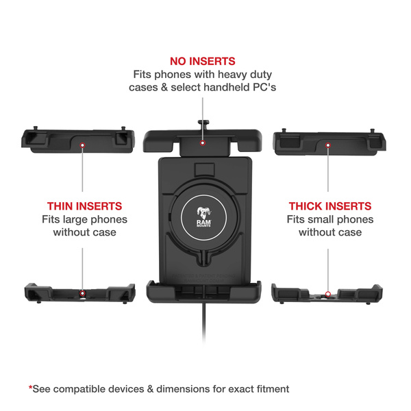 The RAM Quick-Grip Pro XL with Ball & Qi2 15W Wireless Charger (RAM-HOL-PD7B-W2MU) is the next evolution of the RAM Quick-Grip series, re-designed to be the most rugged universal phone holder that fits a wide range of phones and handheld devices. This phone holder comes with the RAM Qi2 wireless charger and features an integrated cavity to secure it in place. This phone holder comes with an anti-slip cover ensuring a flush fit when the wireless charging puck is not installed. The RAM Quick-Grip Pro XL features a spring-loaded design that allows easy one-handed insertion and removal of your device. Large and small shims are included to provide a snug, secure fit for large and small phones without a case. Complete the solution by building your mountthis holder is RAM Compatible and includes a B size diamond ball to be installed on the 2-hole AMPS pattern. RAM recommends installing the provided device tether when this holder is used in a vehicle with an open cockpit. It is important to verify the dimensions of your handheld device with its case, sleeve, or skin when determining the overall size. BrandSymbolRAM-HOL-PD7B-W2MUProducer code793442026744SeriesNewYesHardware IncludedAssembly HardwareHolder DimensionsHeight Range: 5.375" - 7"|Width Range: 2.75" - 3.5"|Max Depth: .75"Ball SizeB Size (1")Weight CapacityStandard Use: 907.18 gramss|Heavy-Duty Use: 453.59 gramsMaterialsHigh strength compositePackaging TypePoly BagPower SpecificationsOperating Frequency: 360KHZ|Stand-by Consumption ~ 0.008A / 8mA @5VDC|80% Wireless Power Transfer Efficiency or Greater|Supports USB 2.0 BC1.2 Power Supply (5V)|Supports Qualcomm QC 2.0, QC 2.0, USB PD 2.0Input VoltageUSB 5V @ 3A|QC2.0 9V @ 2.22A|USB PD 2.0 5-15V @ 2APower OutputBPP - 5W|EPP - 7.5W|MPP - 15WOutput ConnectorUSB Type-C Male with USB-A AdapterOutput Cable Length1 MeterOperating Temperature0°C to +40°CStorage Temperature-20°C to +80°CRegulatoryOver Current Protection|Short Cirtcuit Protection|Over Temperature Protection|RoHS Compliance|WEEE ComplianceCertificationsIP67|SAE J1455|FCC Certification|CE Certification|E-Mark Certification|RCM CertificationComponent partsRAM-B-238URAM-GDS-CHARGE-W2MRAM-HOL-PD7U - CompatibilityApple iPhone 11Apple iPhone 11 ProApple iPhone 11 Pro MaxApple iPhone 12Apple iPhone 12 ProApple iPhone 12 Pro MaxApple iPhone 13Apple iPhone 13 ProApple iPhone 13 Pro MaxApple iPhone 14Apple iPhone 14 PlusApple iPhone 14 ProApple iPhone 14 Pro MaxApple iPhone 15Apple iPhone 15 PlusApple iPhone 15 ProApple iPhone 15 Pro MaxApple iPhone 16Apple iPhone 16 PlusApple iPhone 16 ProApple iPhone 16 Pro MaxApple iPhone 16eApple iPhone 17Apple iPhone 17 ProApple iPhone 17 Pro MaxApple iPhone AirApple iPhone 8Apple iPhone 8 PlusApple iPhone SEApple iPhone XApple iPhone XrApple iPhone XsApple iPhone Xs MaxBlackberry Evolve XGoogle Pixel 3Google Pixel 3 XLGoogle Pixel 4Google Pixel 4 XLGoogle Pixel 5Google Pixel 6Google Pixel 6 ProGoogle Pixel 7Google Pixel 7 ProGoogle Pixel 8Google Pixel 8 ProGoogle Pixel 9Google Pixel 9 ProGoogle Pixel 9 Pro XLGoogle Pixel 9aHuawei Mate 20 ProHuawei P30 ProLG G6LG G6 PlusLG G7 ThinQLG G8 ThinQLG G8S ThinQLG V30LG V35 ThinQLG V40 ThinQLG V50 ThinQNokia 8 SiroccoNokia 9 PureViewPanasonic Eluga X1 ProRazer Phone 2Samsung Galaxy Note 10Samsung Galaxy Note 10 PlusSamsung Galaxy Note 20Samsung Galaxy Note 20 UltraSamsung Galaxy Note 8Samsung Galaxy Note 9Samsung Galaxy S10Samsung Galaxy S10 5GSamsung Galaxy S10 PlusSamsung Galaxy S10eSamsung Galaxy S20 5GSamsung Galaxy S20 FE 5GSamsung Galaxy S20 Plus 5GSamsung Galaxy S20 Ultra 5GSamsung Galaxy S21 5GSamsung Galaxy S21 Plus 5GSamsung Galaxy S21 Ultra 5GSamsung Galaxy S22 5GSamsung Galaxy S22 Plus 5GSamsung Galaxy S22 Ultra 5GSamsung Galaxy S23Samsung Galaxy S23 PlusSamsung Galaxy S23 UltraSamsung Galaxy S24Samsung Galaxy S24 PlusSamsung Galaxy S24 UltraSamsung Galaxy S25Samsung Galaxy S25 PlusSamsung Galaxy S25 UltraSamsung Galaxy S8Samsung Galaxy S8 ActiveSamsung Galaxy S8 PlusSamsung Galaxy S9Samsung Galaxy S9 PlusSony Xperia XZ2Sony Xperia XZ3Xiaomi Mi 9Xiaomi Mi 9 ExplorerXiaomi Mi Mix 2SXiaomi Mi Mix 3