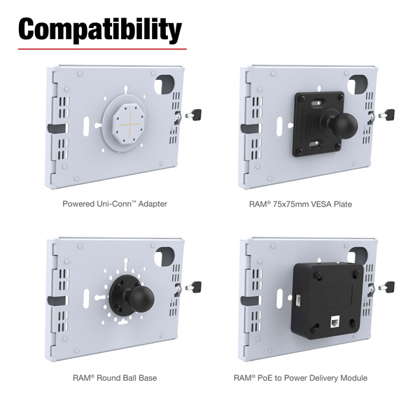The RAM Safe-Case for Apple iPad mini (A17 Pro) & mini 6 (RAM-TE-AP36) is a rugged, modular enclosure designed for high-security environments. Built from durable two-piece steel, this key-locking tablet case protects against theft, tampering, and tough environmental conditionsideal for demanding field or industrial applications. Custom-fit for the Apple iPad mini, the Safe-Case features precision cutouts for full access to the devices lock button, USB-C port, and rear camera. Ventilation slots and speaker openings maintain device functionality without compromising protection. The smooth gray finish not only blends well into professional and industrial settings but also adds a clean, modern aesthetic. The enclosure features versatile mounting options with integrated hole patterns for flush mounting, compatibility with RAM double ball mounts, or 75x75mm VESA stands. For added docking functionality, the Safe-Case supports the installation of a GDS Uni-Conn buttonenabling rear pogo pin charging when paired with any compatible GDS dock (look for the octagon icon on product listings). BrandSymbolRAM-TE-AP36-GRYProducer code793442028458SeriesNewYesHardware IncludedAssembly Hardware|(4) #8-32 x 1/2" Machine Screws|(4) #8-32 Nylock Nuts|(4) #10-24 x 1/2" Machine Screws|(4) #10-24 x 5/8" Machine Screws|(4) #10-24 Nylock Nuts|(2) #6-32 x 3/4" Machine Screws|(2) #6 Fender Washers|(1) 90 Degree USB-C CableProduct DimensionsOverall Height: 9.7" Overall Width: 6.62" Overall Thickness: .79"Packaging TypeBox - CompatibilityApple iPad mini (A17 Pro)Apple iPad mini 6