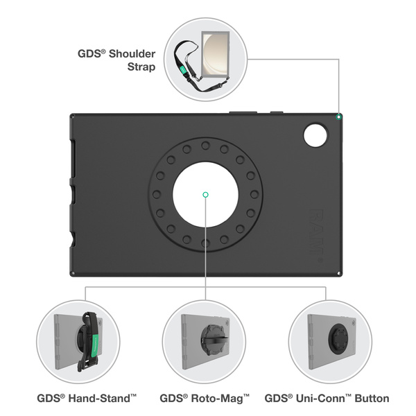 The RAM Skin for Samsung Tab A9 (RAM-SKIN-SAM97) is a form-fit, MIL-STD-810H drop test protected sleeve designed specifically for the Tab A9. It is a non-powered accessory and features an ergonomic accessory access point integrated into the back for accessories like the GDS Uni-Conn Adapter, GDS Hand Strap, GDS Hand-Stand, and the GDS Roto-Mag. Additional accessory access points are integrated into the corners of the RAM Skin, an ideal location to secure the GDS Shoulder Strap or GDS Wrist Strap. This sleeve covers the volume and lock buttons to keep dirt and debris out and designed to leave the camera, USB-C port, and headphone jack accessible. BrandSymbolRAM-SKIN-SAM97Producer code793442026904SeriesProduct Weight141 gMaterialsPolycarbonate and Thermoplastic ElastomersPackaging TypePoly Bag - CompatibilitySamsung Tab A9