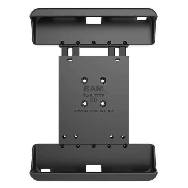 The RAM Tab-Tite spring loaded, quick release cradle offers a secure fit with easy access to the mounted tablet. The interchangeable cup ends are designed specifically for the Samsung Galaxy Tab 4 10.1 and Tab S 10.5 with an Otterbox Defender case, but also support many other tablet models and industrial tablet PC's. The spring loaded design makes it easy to insert and remove your tablet, along with keeping it secure in mobile applications. The custom end cups are designed to optimize the functionality of your tablet, enabling access to all ports and tablet functions. The included back plate is interchangeable with various size support cups, making it compatible with numerous tablet models. New detachable support cups are the only components needed for purchase, attach to the back plate for support of your new tablet. Included is a set of four nuts and bolts to connect the cradle to any RAM components or mounts that contain the universal AMPs hole pattern. For off-road environments and extreme use, we recommended the use of a tether to assist in retaining your device. The Tab-Tite cradle is compatible with any tablet that will fit the dimensions listed below. It is important to verify the dimensions of your tablet when determining the overall size. Note: Product consists of holder only. Case not included. BrandSymbolRAM-HOL-TAB25UProducer code793442947667SeriesProduct Weight281 g295 gHardware IncludedAssembly Hardware|(4) #8-32 x 5/8" Machine Screws|(4) #8-32 x 1/2" Machine Screws|(4) #8-32 Nylock NutsHolder DimensionsHeight Range: 9.64" - 12.32"|Width Range: 6.13" - 7.4"|Depth Range: .13" - .7"Hole Pattern4-Hole AMPS: 1.181" x 1.496"AMPS 4-HoleMaterialsHigh strength compositePackaging TypePoly BagDevice or Accessory TypeTabletComponent partsRAM-HOL-ACURAM-HOL-TAB25-CUPSU - CompatibilityDell Venue 11 ProHP Pro Slate 10.1Lenovo IdeaTab Lynx K3011Microsoft Surface 2Microsoft Surface 3Microsoft Surface ProMicrosoft Surface Pro 2Samsung Galaxy Tab 4 10.1 with CaseSamsung Galaxy Tab A 10.1 (2019) with CaseSamsung Galaxy Tab E 9.6 with CaseSamsung Galaxy Tab S 10.5 with CaseSony Vaio Tap 11Zebra ET50 10"Zebra ET55 10"Samsung Galaxy Tab S10 FE with Case