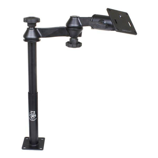 The RAM-VP-SW1-129-2461 consists of a 9" lower female Tele-Pole, 12" upper male Tele-Pole, double swing arm and 3.625" square base that contains the VESA hole pattern. The lower female Tele-Pole will attach to all RAM vehicles bases that do not contain a welded female Tele-Pole. The height of the Tele-Poles, combinded, can easily be adjusted by turning the knob at the top of the post. Once the knob has been tightened, the Tele-Pole becomes a rigid support for connecting devices or cradles. The double swing arm allows you to twist and tilt the viewing angle of your connected electronic device, when mounted on your RAM Vehicle Mount. The rotating swivel arm gives you even more viewing positions for your mounted electronic device while holding everything firmly in place. The length of the double swing arm is 12". The 3.625" square base includes a 75mm X 75mm VESA hole pattern with 1.5" rubber ball positioned 0.88" from the center of one edge. BrandSymbolRAM-VP-SW1-129-2461Producer code793442935381SeriesProduct Weight2971 g3556 gHardware IncludedAssembly Hardware|(4) 5/16"-18 x 1" Carriage Bolts|(4) 5/16"-18 Hex Nuts|(4) 5/16" Flat Washers|(4) 5/16" Split Lock Washers|(4) Rubber CapsProduct DimensionsMinimum Height: 20.3"|Maximum Height: 25.3"Hole PatternTele-Pole: 2.625" x 2.625"|VESA Plate: 75 x 75mm VESA75 x 75 VESAPlate SizeVESA Plate: 3.625" x 3.625"|Lower Pole: 3.5" x 3.5"MaterialsPowder coated steel|Marine-grade aluminumPackaging TypeBoxMounting TypeDrill DownBall & Socket SizeC Size 1.5" (Holds 1814.37 gramss)Device or Accessory TypeMonitorComponent partsRAM-2461URAM-VB-110-1NBURAM-VP-TBF9URAM-VP-TTM12UBall SizeC Size (1.5") - Recommended products